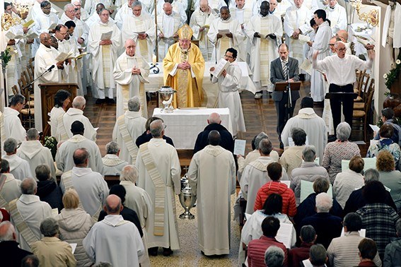 "Nous célébrons la messe chrismale. En premier lieu, j'éprouve le besoin de vous remercier, vous les fidèles du Christ, vous tous qui portez la mission de l'Église dans nos paroisses et nos diverses communautés, parfois de manière discrète. Merci.