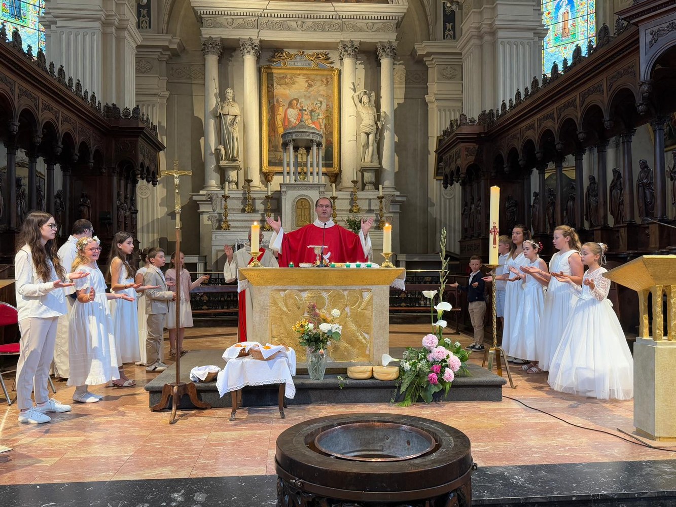 Ils ont reçus pour la première fois le sacrement de l'Eucharistie . Les mains tendues, en forme de tabernacle, ils ont reçu ce trésor, le vrai pain venu du ciel, en nourriture qui ne se perd pas mais inonde tout leur être, corps, cœur, esprit.