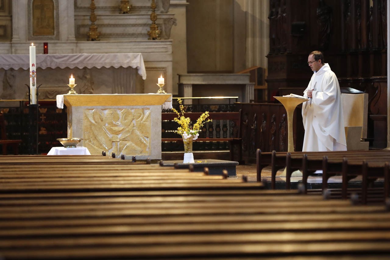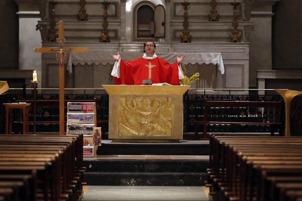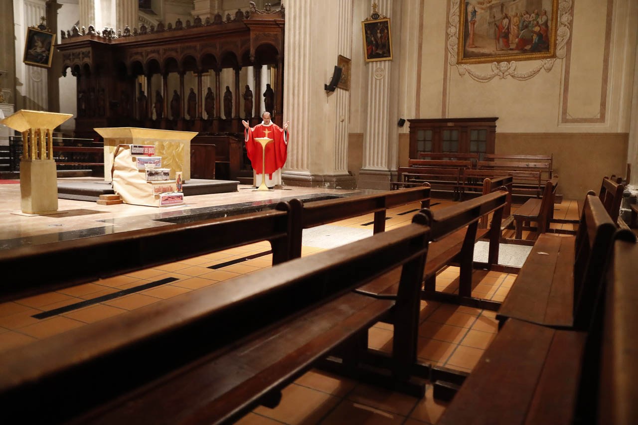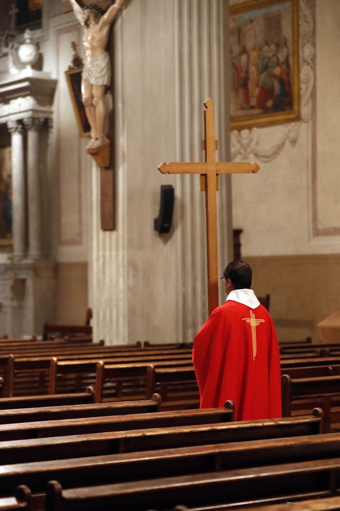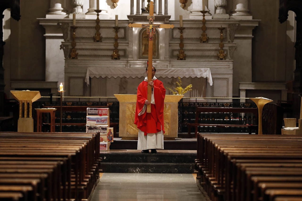 Eglise Saint Jacques de Sallanches : célébrations du vendredi saint et du dimanche de Pâques 2020 en l'absence de fidèles. Photos de Pascal Deloche, de l'agence Godong