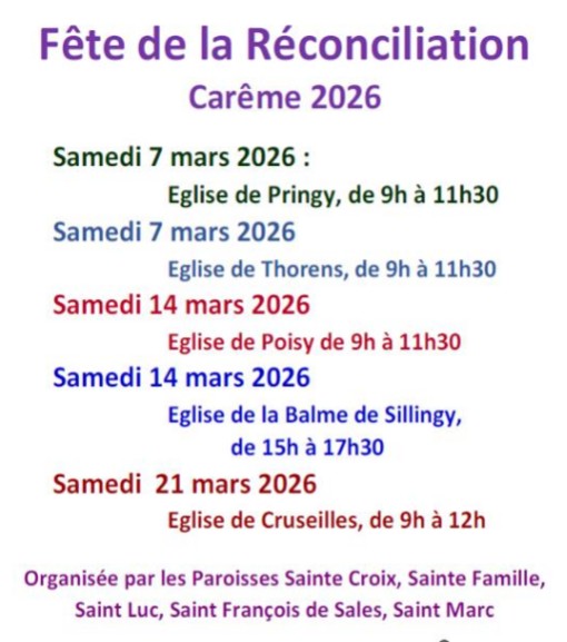 Durant le mois de mars, les paroisses du doyenné du Parmelan organisent des fêtes du Pardon les samedi matin et après-midi, ouvert à tous, petits et grands. Un parcours de réflexion est proposé pour réfléchir sur le sens du Pardon et du sacrement de réconciliation qui est proposé en fin de parcours, et pour ceux qui le désirent par des prêtres à disposition.