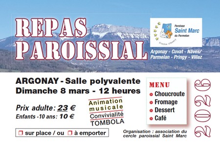 Repas paroissial Quand le 08/03/2026 de 12h00 à 16h00 Où salle polyvalente d'Argonay Ajouter l'événement au calendrier vCal iCal
