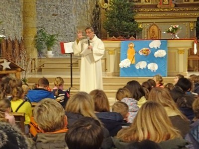 Autour de leurs enseignants, parents ou grands-parents, les enfants ont échangé avec le Père Henri sur le mystère Noël : « Les bergers à qui les anges ont annoncé la naissance de Jésus, dans une étable. » (St Luc)