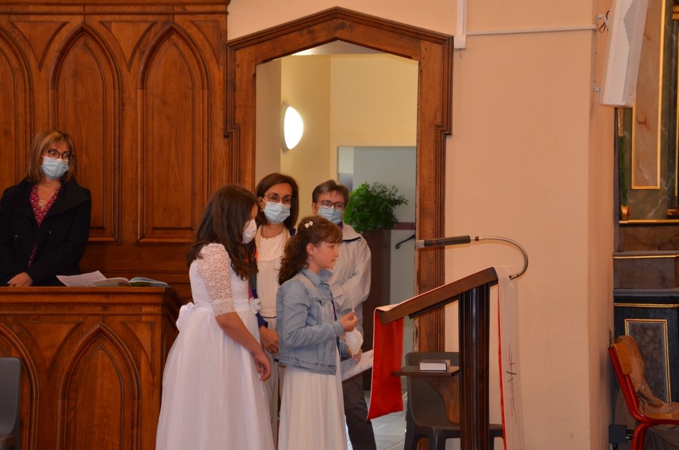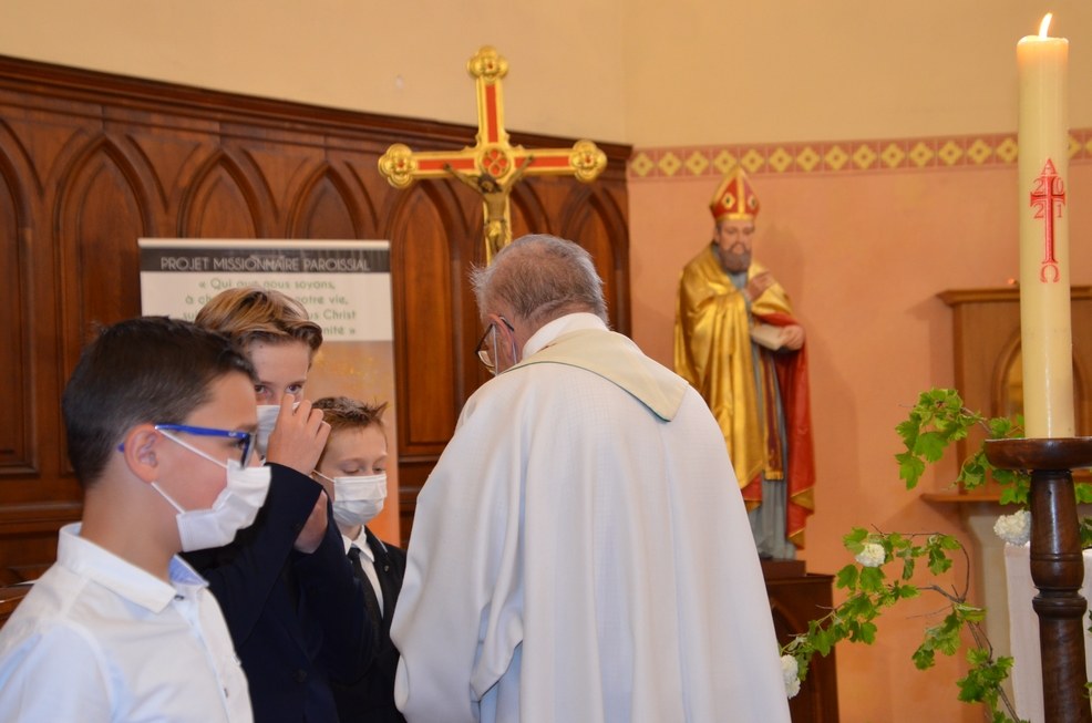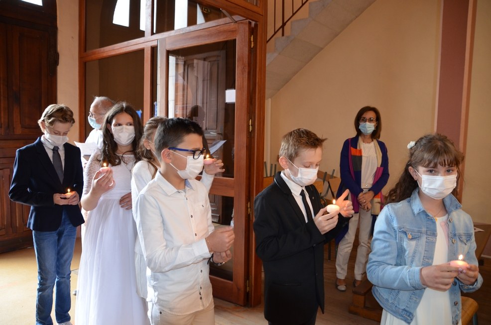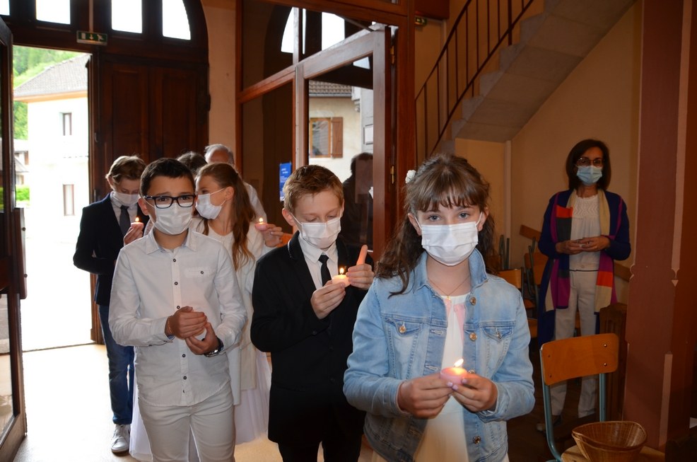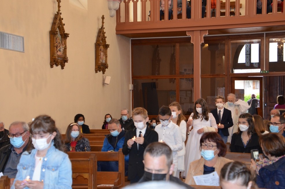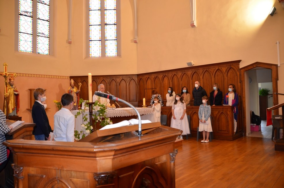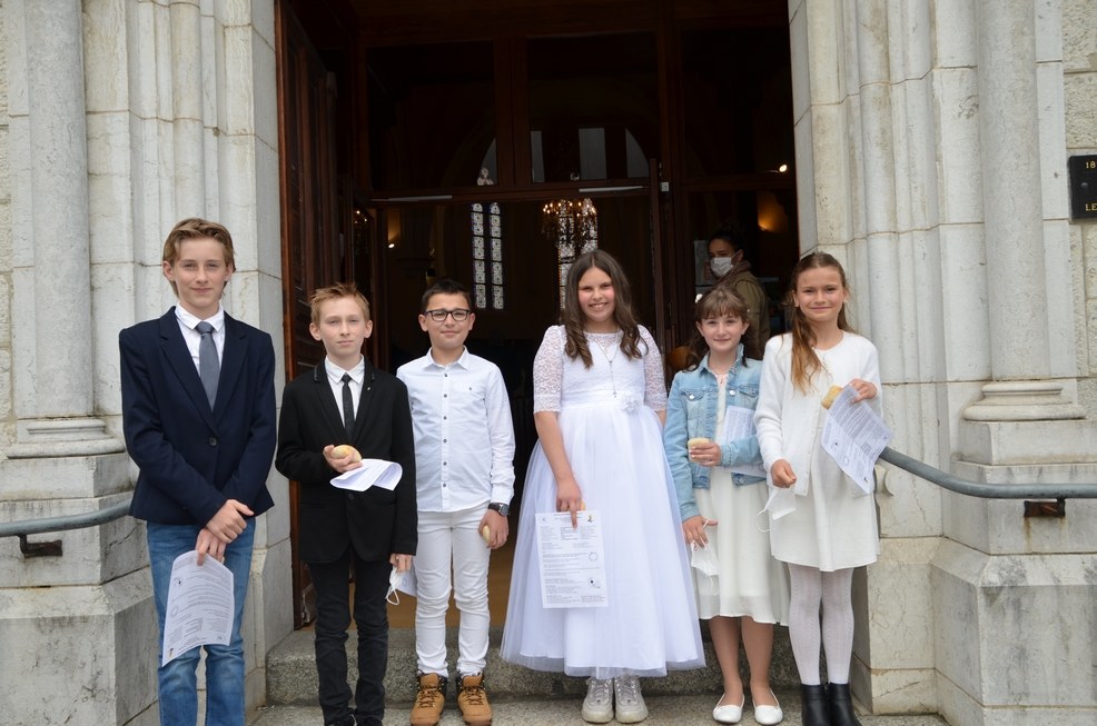 Après une année d'attente, notre 3ème groupe composé d’Élise, Elena, Clara, Matteo et nos petits lyonnais Arthur et Clément ont enfin pu communier pour la première fois en l'église de La Balme de Sillingy sous une assemblée masquée mais heureuse. La cérémonie a été officiée par le Père Jean-Claude Sancey. En cette fête de l'Ascension et de Notre-Dame de Fátima, nous avons aussi eu la joie d'entendre pour la première fois, le groupe musique junior en union avec nos communiants.