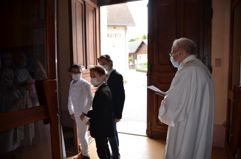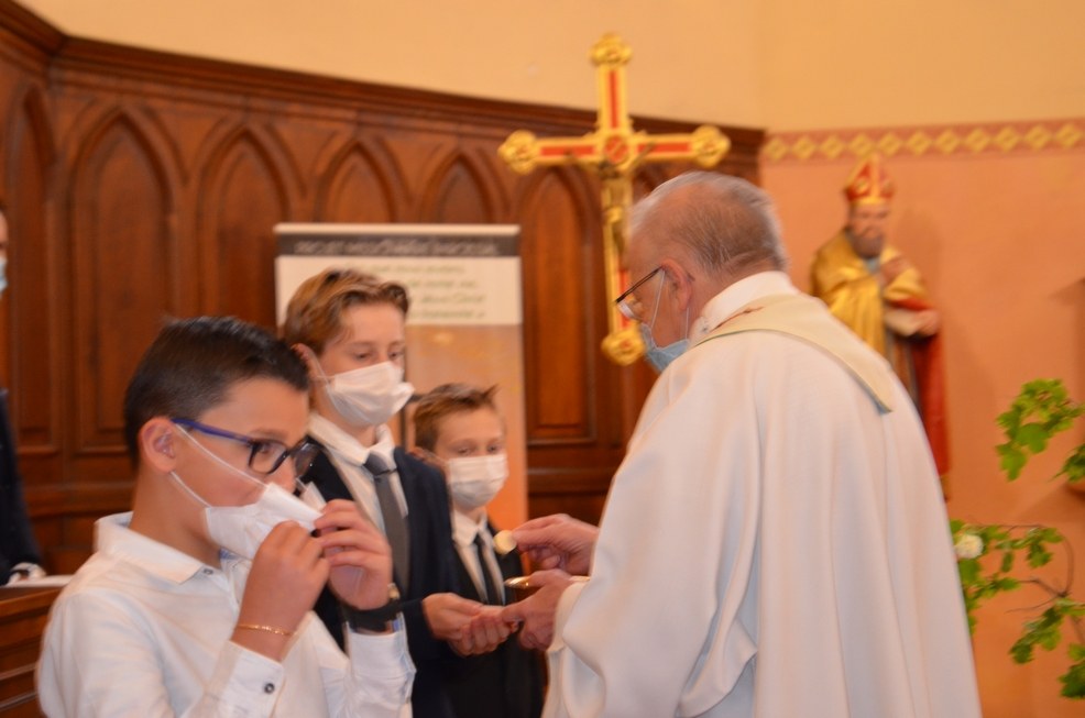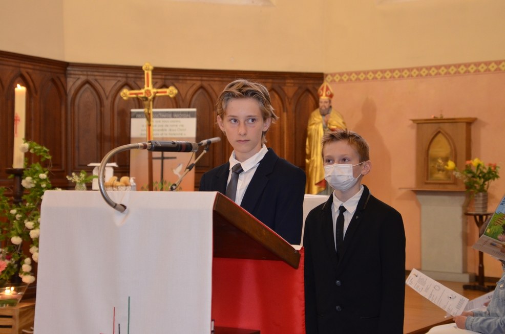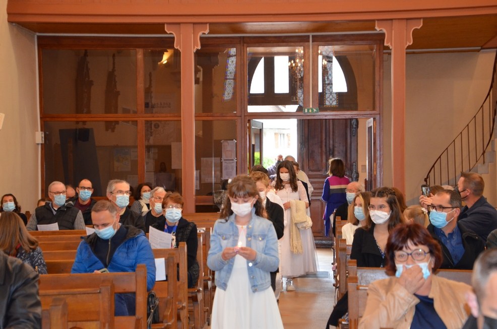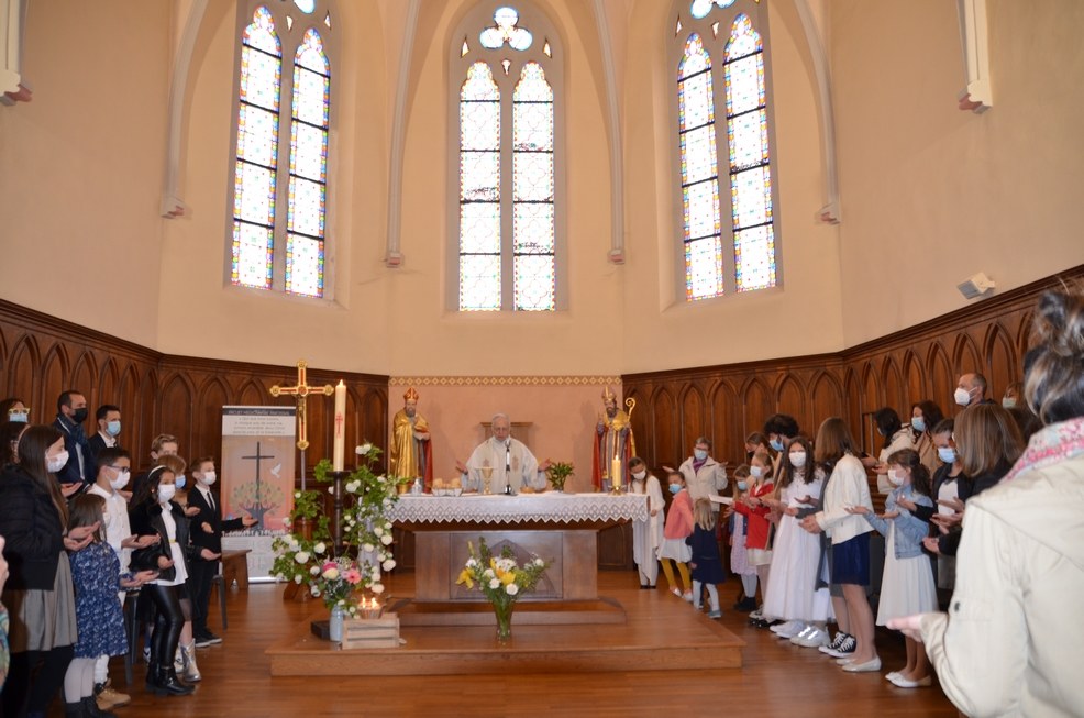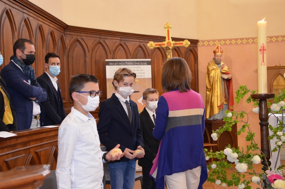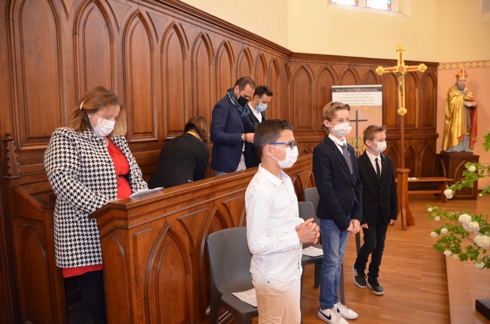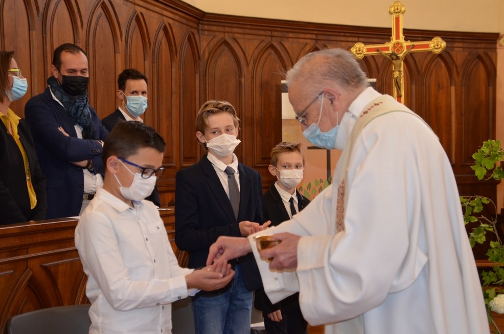 Après une année d'attente, notre 3ème groupe composé d’Élise, Elena, Clara, Matteo et nos petits lyonnais Arthur et Clément ont enfin pu communier pour la première fois en l'église de La Balme de Sillingy sous une assemblée masquée mais heureuse. La cérémonie a été officiée par le Père Jean-Claude Sancey. En cette fête de l'Ascension et de Notre-Dame de Fátima, nous avons aussi eu la joie d'entendre pour la première fois, le groupe musique junior en union avec nos communiants.
